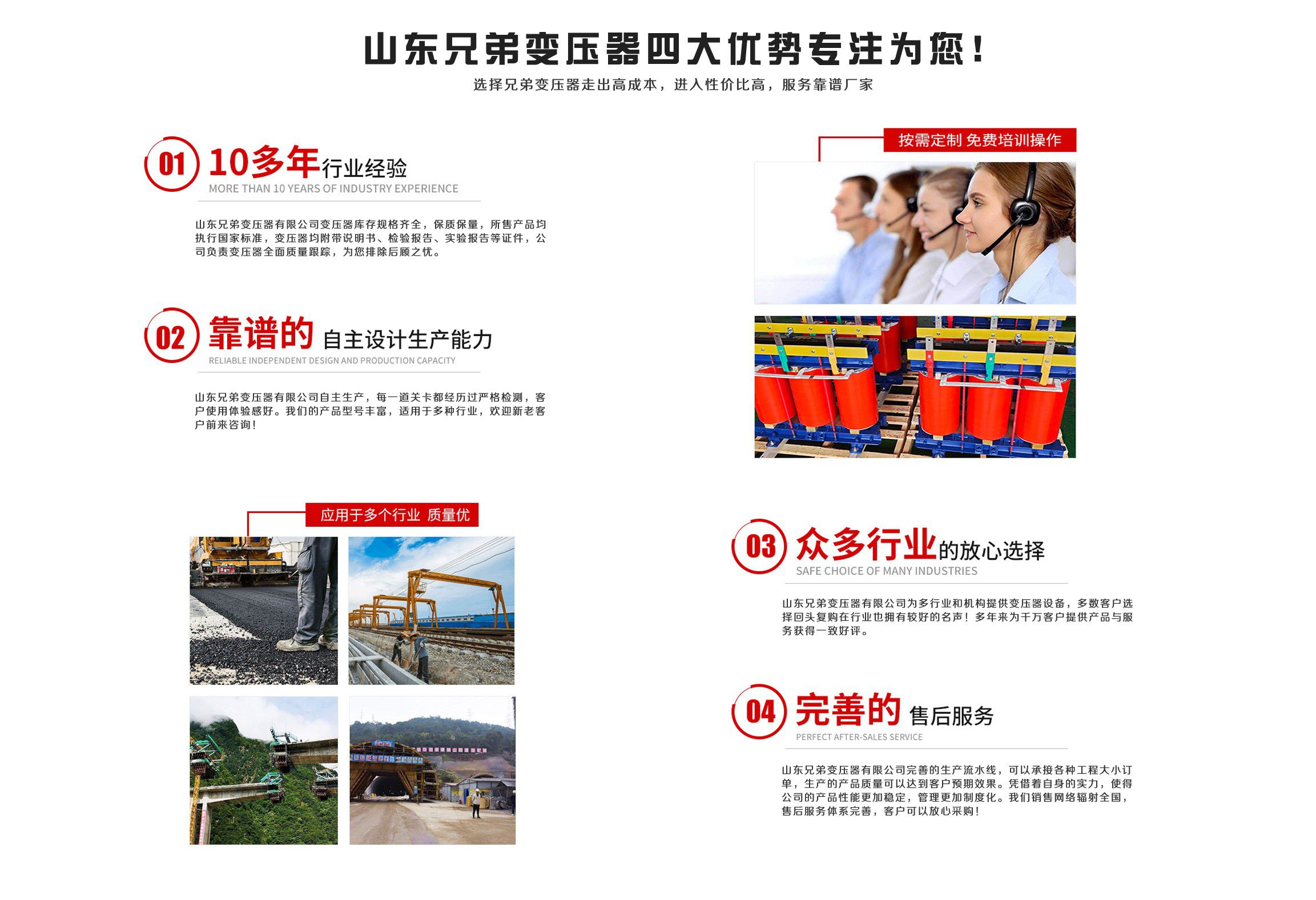 山東兄弟變壓器有限公司經營SCB10干式變壓器,SCB11干式變壓器價格,SCB12變壓器,SCB13干式變壓器,SCB14干式變壓器,SCB18干式變壓器等產品及用戶要求的特殊變壓器?! 」镜馁|量方針是:“顧客的滿意,是我公司的追求?!眻猿仲|量,用戶至上,以質興業,以優取勝,愿為廣大用戶設計各種要求的變壓器,以求共同發展?! ∑髽I精神:“創新、求實、誠信、高效”。  企業作風:“嚴、細、實、快”?! ∑髽I工作方針:“加強內部管理,夯實基礎,全面提高職工整體素質,使企業管理水平再上新的臺階”。  公...